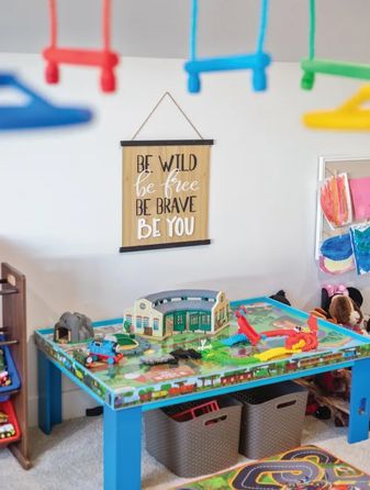 The couple almost found themselves in a pickle with garage stalls full and not enough places to put everything. The new home concept didn’t have as many nooks, crannies, and storage spaces as their prior home. The garage organization system was a bit of a last-minute decision created by Mac’s contractor buddy from Wyoming and one that Alicia describes as “the single best decision ever made.” Everyone who has visited has asked about it, and with 30 storage totes, the family is “more organized today than we have ever been.”