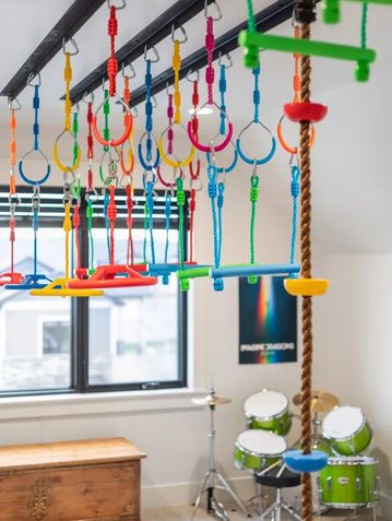 The couple’s oldest son is obsessed with the ninja warrior course that Mac needed to create a tall enough roofline to accommodate. The other half of the room features a movie and gaming area for the boys to enjoy as they grow. There’s even a patio off of the playroom on the second story that Quinn wanted to add. Alicia says, “the space turned out so much better than we could have envisioned!”