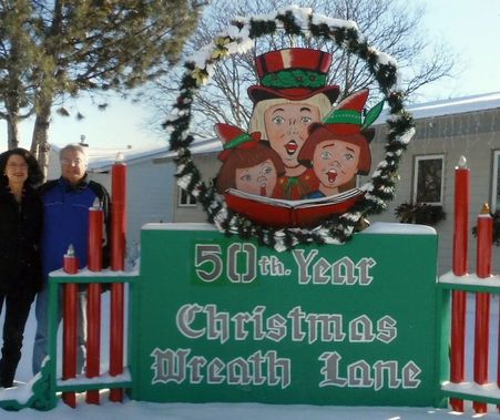 Though the houses on Christmas Wreath Lane might include other decorations, the wreaths remain the same, although they are each decorated to their homeowner’s preference – with the exception of the 50th anniversary when they all dazzled in gold. The corner houses don a large display indicating which anniversary it is, and there have been many years that the seekers of all things Christmas lights have caught a glimpse of Santa (Bill Burdge) visiting the Lane.