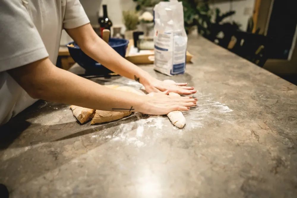 - Dust a clean counter with flour. Pour dough onto the counter and knead it into a smooth ball. Cut into 6 even wedges. Starting with one wedge, roll into a log and then into a long strip about 20 inches long. Cut the strip into 20 pieces, no longer than 1 inch. Roll each piece into a smooth cylinder. Add flour to a baking sheet. Place formed dumplings onto a baking sheet while you make the rest of them. Repeat with the rest of the dough wedges.