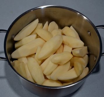 Once all potatoes are peeled, rinsed, sliced, and in the pot, sprinkle salt over top, then fill pot with water until potatoes are covered. Put lid on and set aside until time to boil.