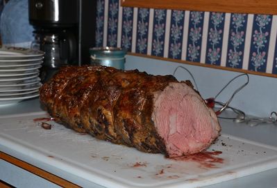 10am – Since we have hours yet before the meat needs to go in the oven, dad first “marks” the roast (making minute slices in the top to make sure we’ll have enough for everyone), next we (liberally) season the top of the roast with Lawry’s seasoning salt, pepper, and later will add garlic powder (Internet wisdom advises to season all sides, however lack of flavor has never been a problem). Back in the fridge it goes.