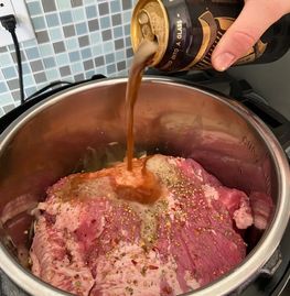 - Place onion and garlic into an instant pot. Gently place brisket on top of the onion mixture and sprinkle with pickling spice. Top with beer and beef broth.