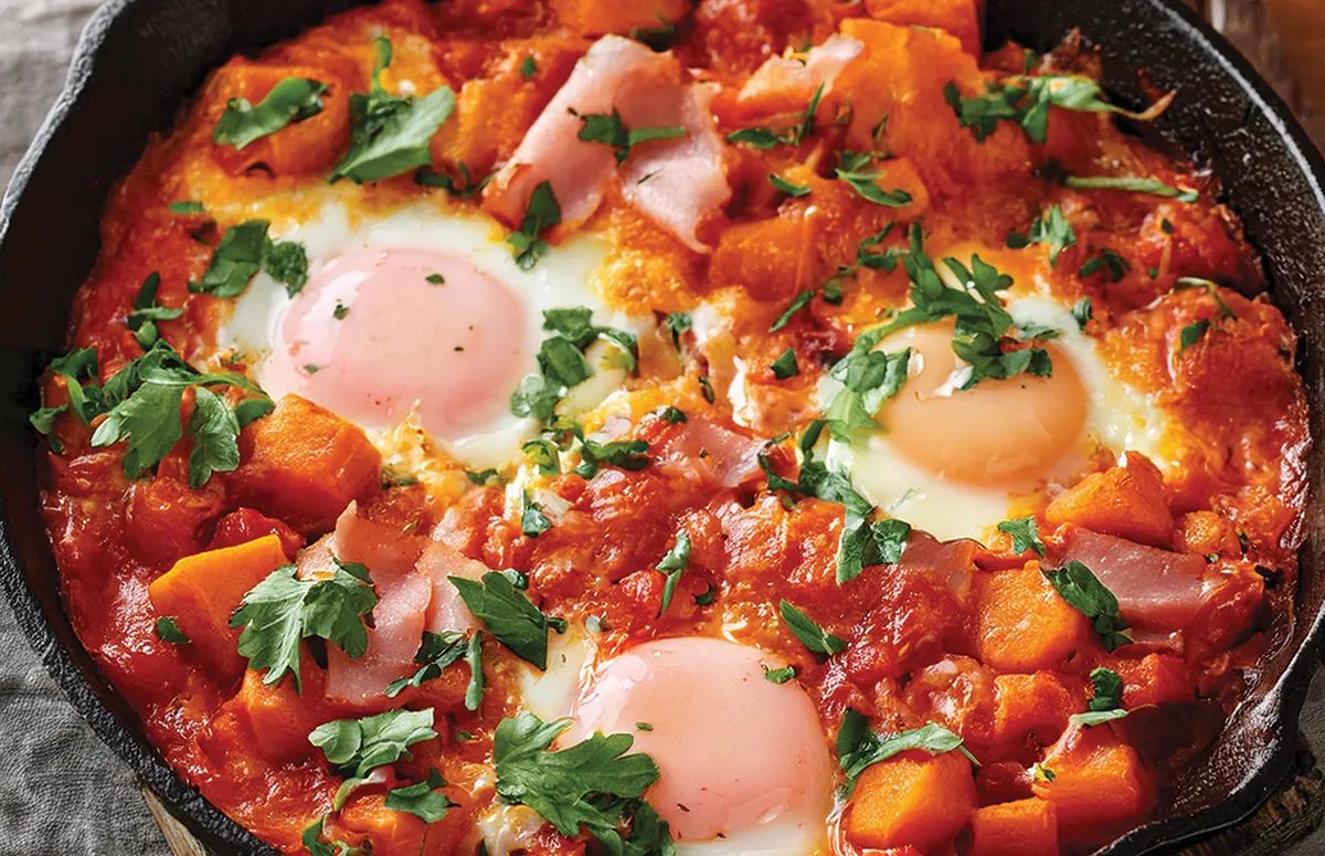 Directions: Heat oil, add sweet potatoes, paprika, and tomatoes. Simmer and stir in ham. Crack the eggs over the top, cover, and cook until whites are set.
