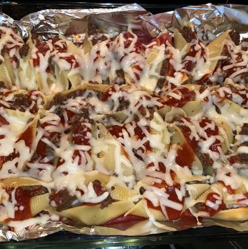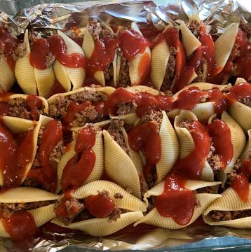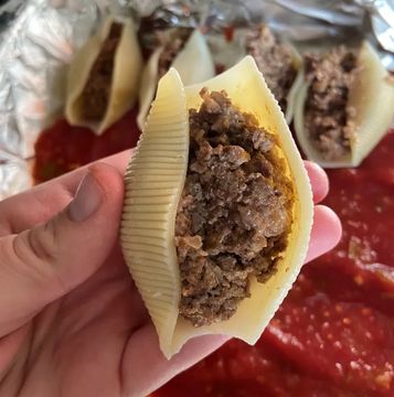 - While ground beef is cooking, cook the pasta shells according to package directions; drain. Set shells out individually on cutting board or baking sheet so that they don’t stick together.