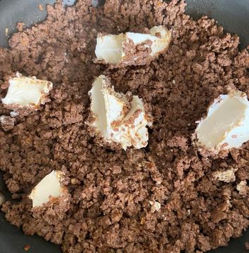 - In a pan, brown the ground beef; add taco seasoning and cook all the way through. Add cream cheese, cover and simmer until cheese is melted. Stir together and mix well. Set aside and cool.