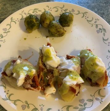 - Toppings – sour cream, green onions, salsa, guacamole, olives