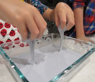 As students get older, you can discuss slime's molecular structure and the physics behind how the material is behaving. Slime is a non-Newtonian fluid, meaning that it doesn't behave like water or other liquids that follow Newtonian laws. When you squeeze it, it can feel more solid (this is particularly true for oobleck, made from cornstarch and water); when you release it, it runs out between your fingers. When questions arise, answering, "I don't know, but what do you think?" assures students that they have the necessary background to come to a conclusion.