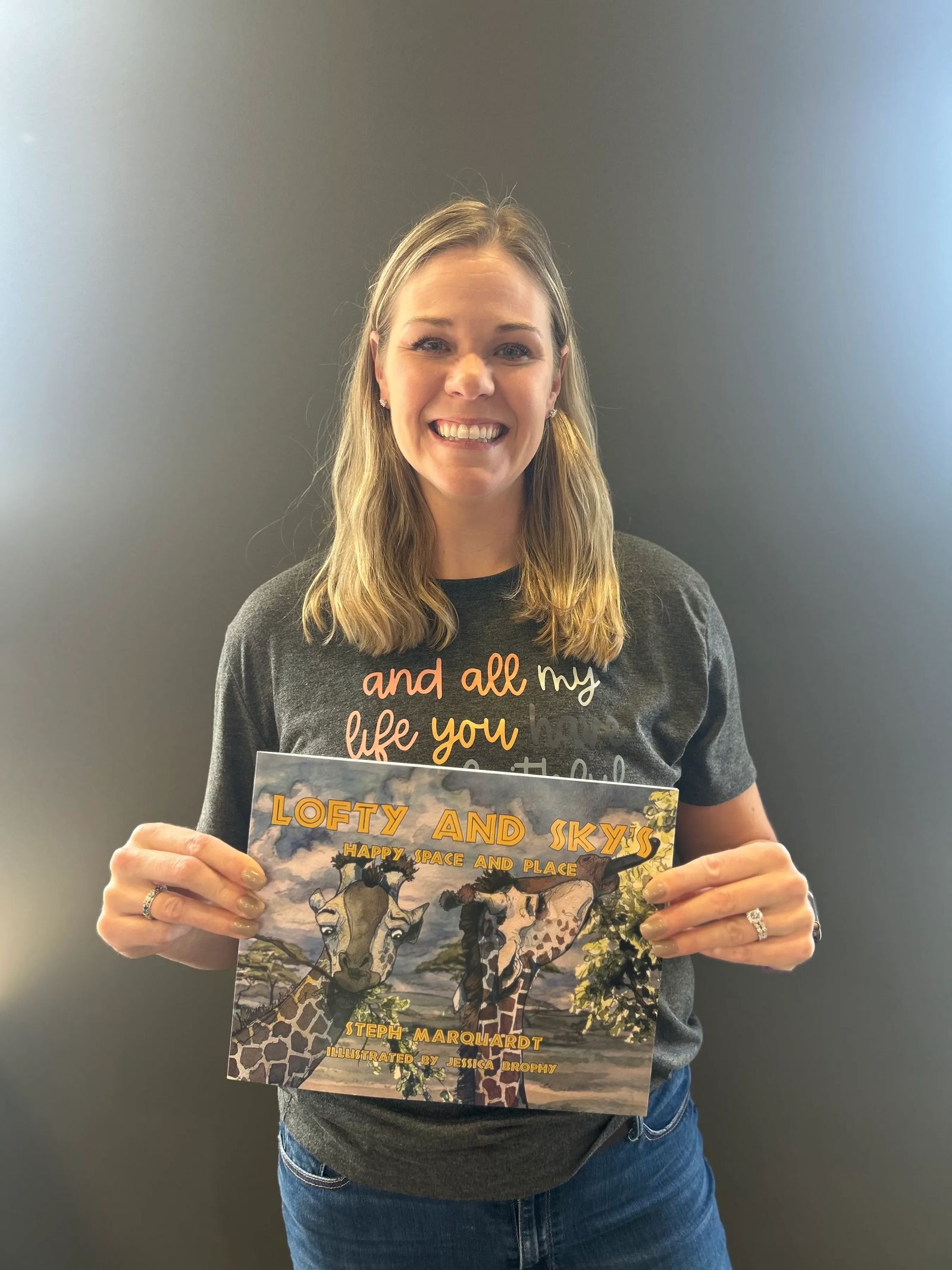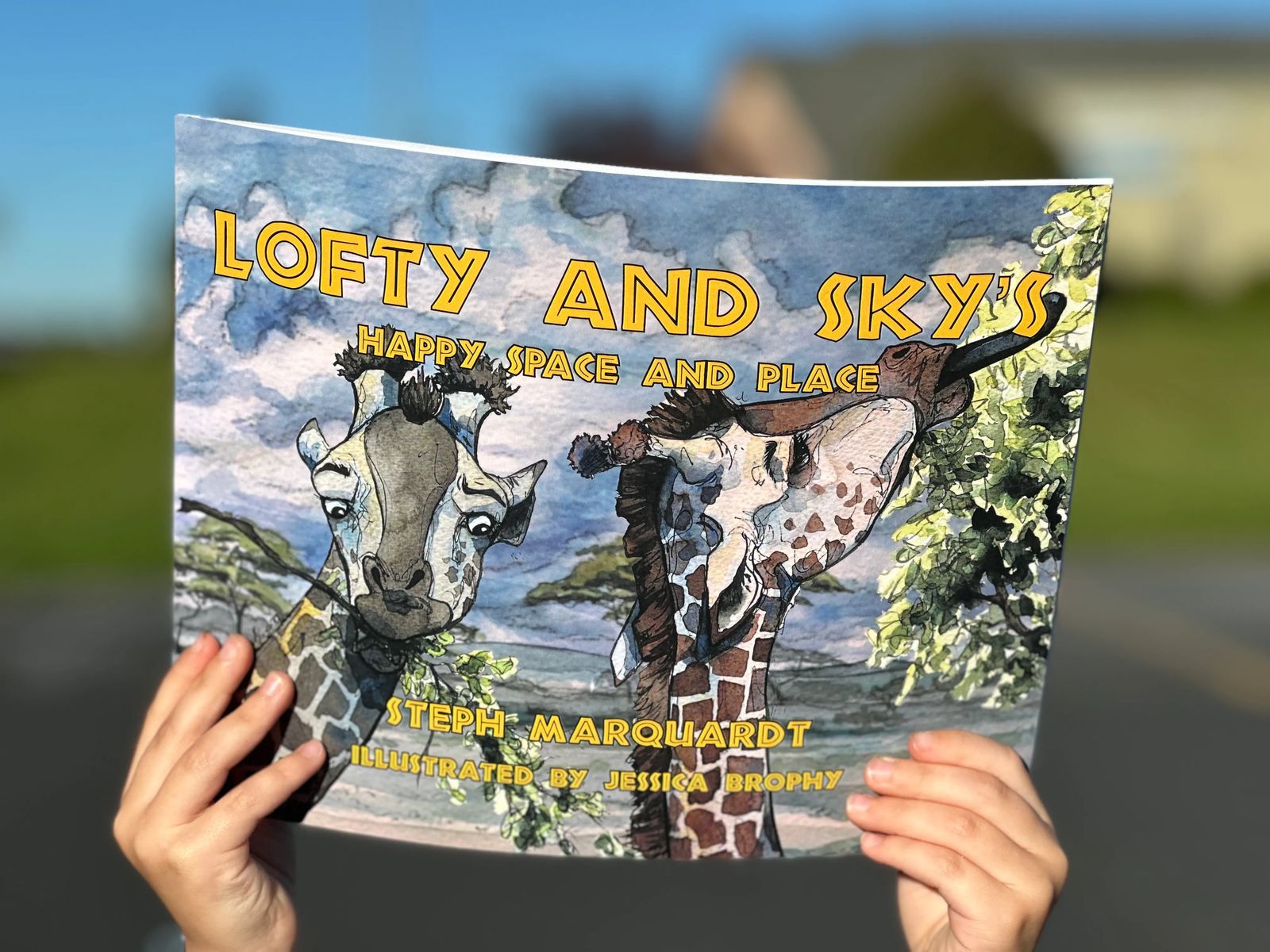 The creation of Lofty and Sky’s Happy Space and Place wouldn’t have been complete without the stunning illustrations by local artist Jessica Brophy, whose artwork beautifully captures the essence of the story. Steph and Jessica formed an incredible partnership, working closely to bring the characters and scenes to life. Steph’s favorite animal, giraffes, inspired the main characters. “I’ve always related to giraffes,” Steph explained. “They’re tall and a little clumsy—like me!” She describes how they make her smile and laugh, especially how they run. But at the same time, they have stately and incredible creatures.