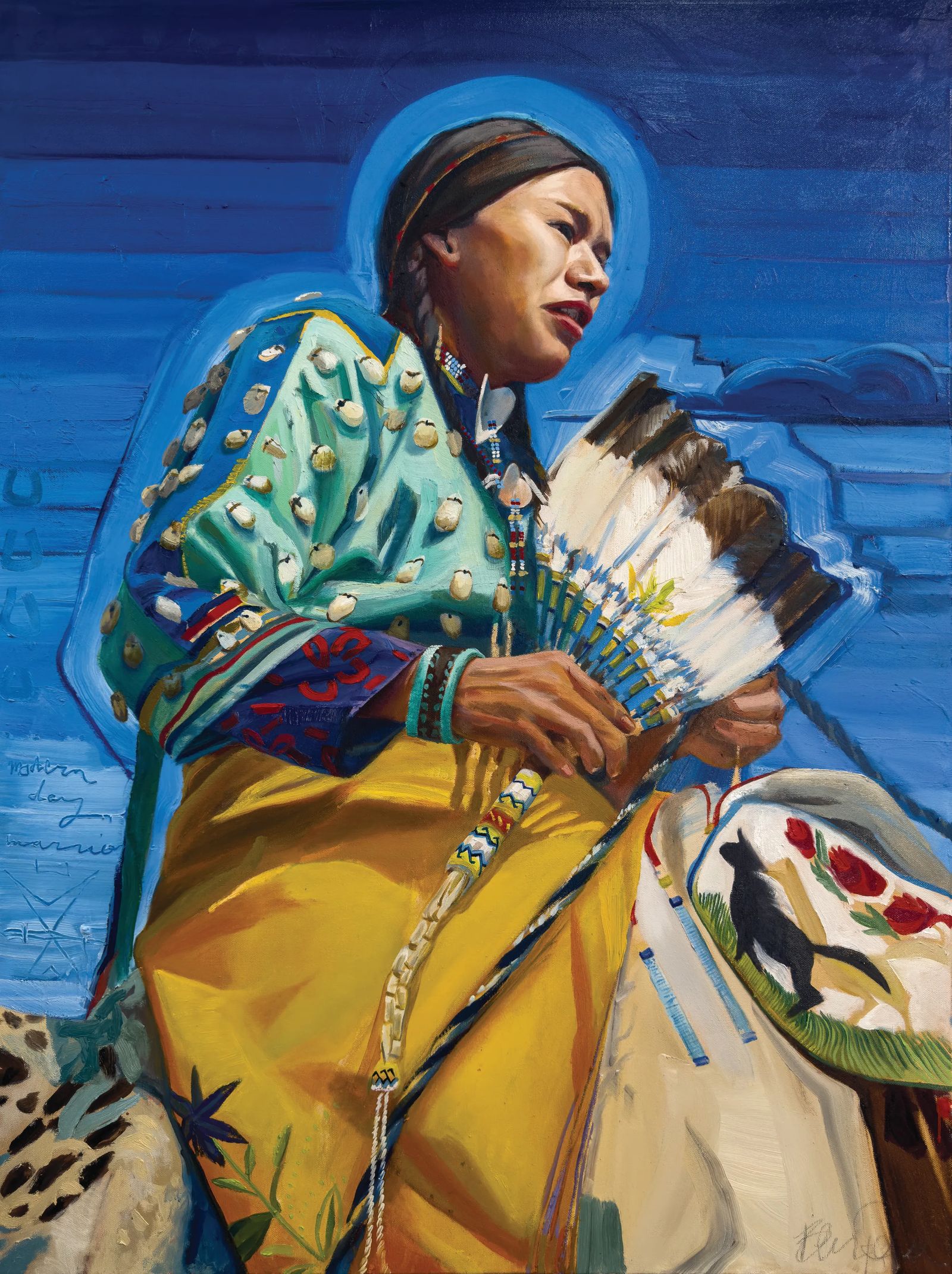 Artwork by Ben Pease - Modern-Day Warrior- iichíilehéeleen íluush(Stands Among The Horses- Kloe Real Bird) Oil on Canvas. 2025