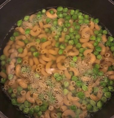 - Bring a large pot of salted water to a boil over high heat. Add the noodles and cook per package directions. A minute or so before the noodles are done, add the frozen peas to the boiling water. Once the noodles are cooked to your liking, drain the noodles and peas and set aside.