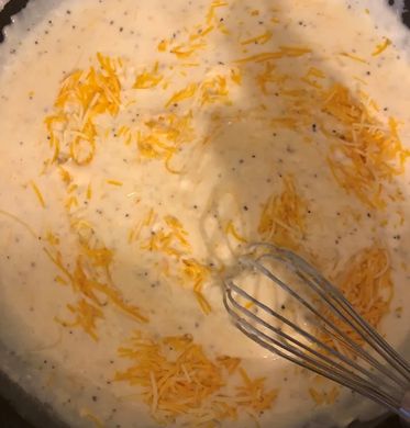 - While the noodles are cooking, set a large skillet over medium heat. Add the butter and swirl until melted. Stir in the flour and continuously whisk for 2 minutes. Continue to whisk vigorously as you slowly and gradually pour in the milk. Stir until smooth and bring to a simmer, whisking regularly to prevent the bottom from burning. Cook for a minute or two until the sauce has thickened. Remove from the heat, stir in seasonings. Gradually blend in the cheddar until melted, and then stir in the drained tuna.
