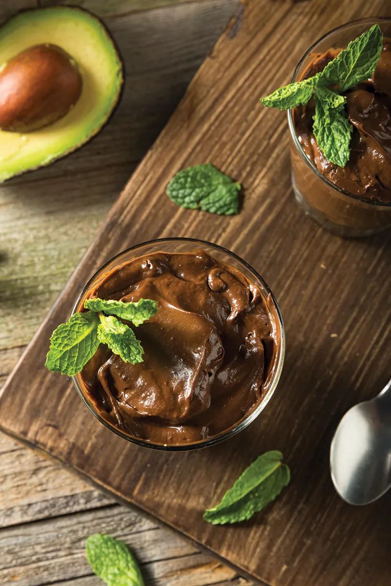 Blend 2 ripe avocados with 1 Cup spinach, ½ Cup cocoa powder, 2-3 Tablespoons of honey, and ½ Cup creamy coconut milk. Refrigerate for 2 hours before serving.