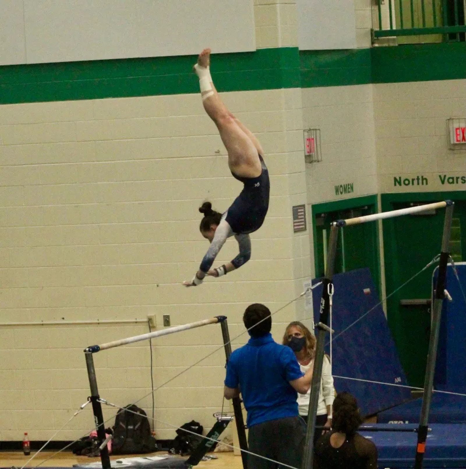 Delaney is flipping between the bars at State, where she placed 1st out of the entire state | photo courtesy of Denis Berry