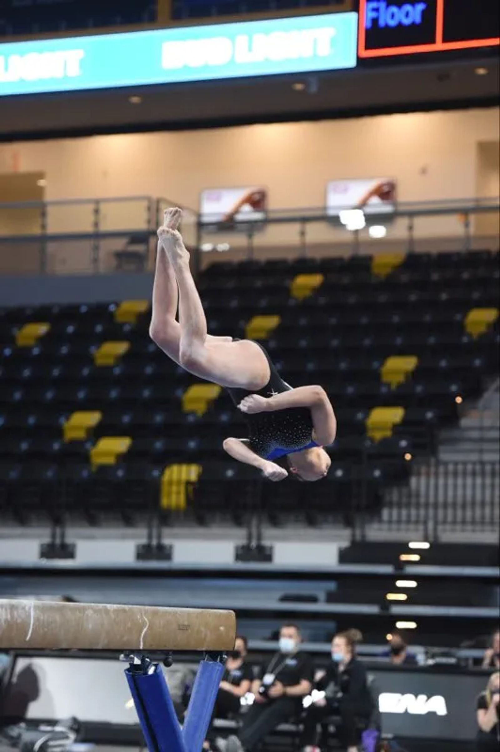 Lydia is twisting off the Beam at Westerns | photo courtesy of Denis Berry