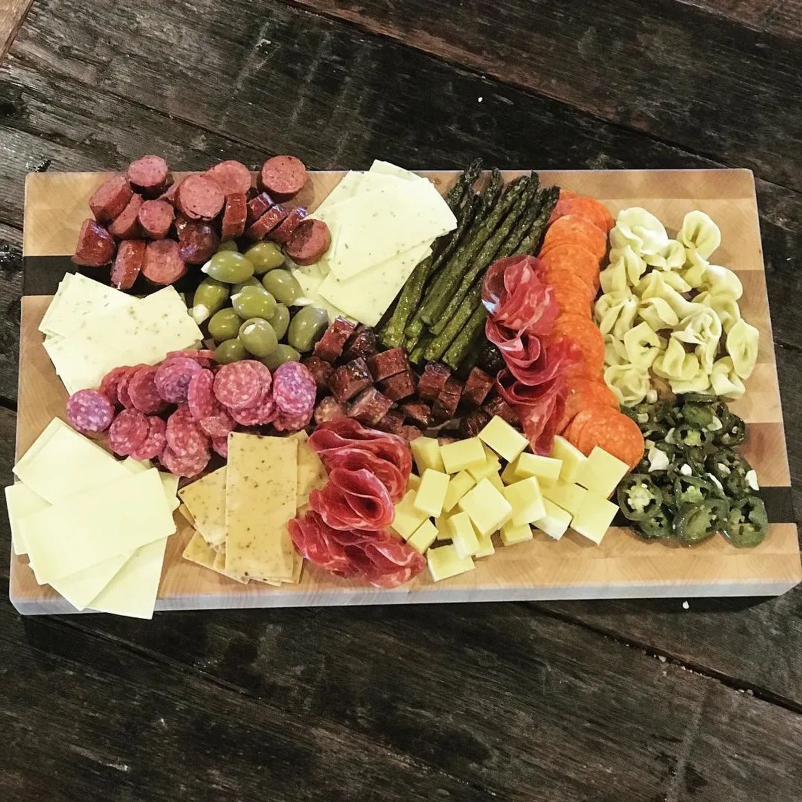 Originally, charcuterie referred only to a variety of cured Italian meats, but today, most people include with their charcuterie boards a combination of cured meats in addition to cheese, fruits, olives, vegetables, crackers and toasted bread, dips and spreads, and/or nuts.