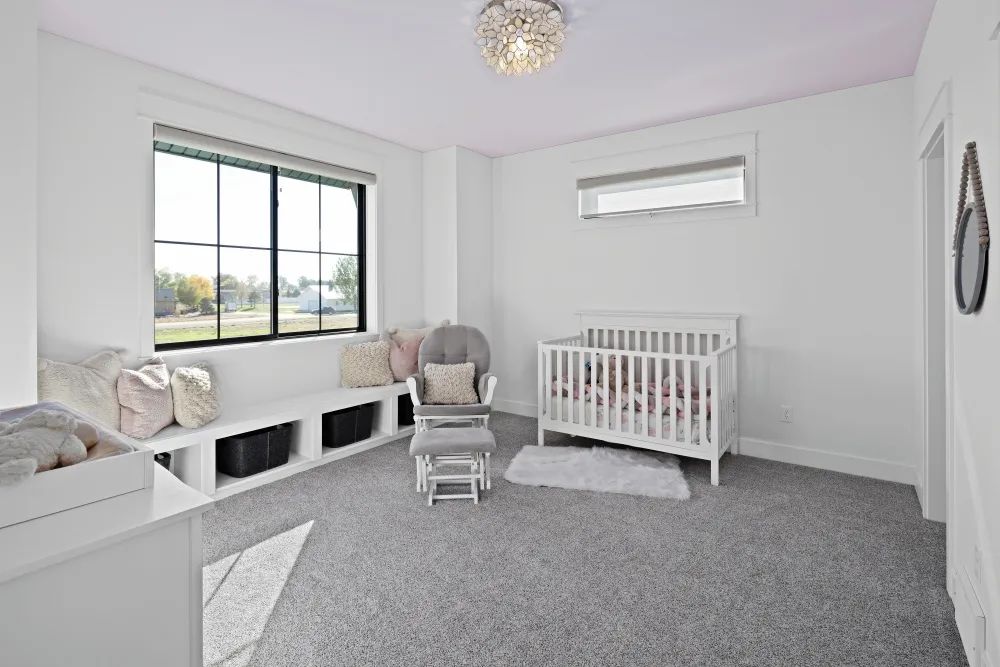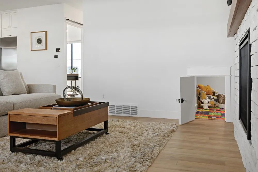 “We wanted a space for our children to play and relax in the home,” says Melissa of the built-in play nook located on the main floor and entire upstairs living room. They currently have a 21-month-old, Harper, and a 3-month-old, Mylie. Harper has fun in her play nook, where she frequently goes grocery shopping, takes care of her baby, and reads books. And Melissa loves it, too, because she can easily clean up the main floor mess by tossing the toys in the nook and closing the door.