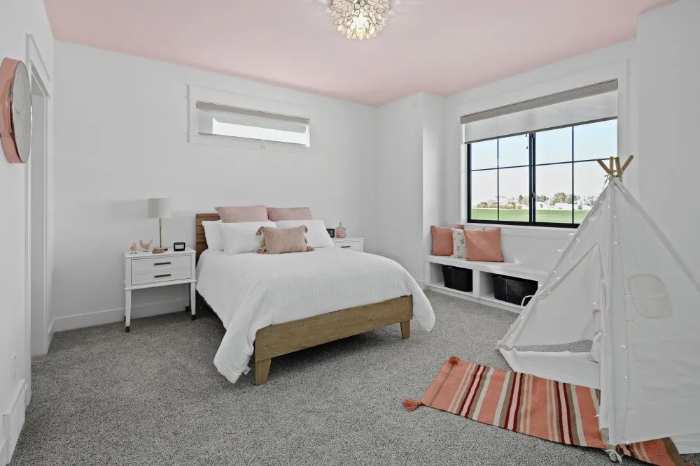 Harper and Mylie’s bedrooms, one with a pale pink painted ceiling and a pale lavender in the other, are mirror images of one another, separated by a beautiful Jill and Jill bathroom.