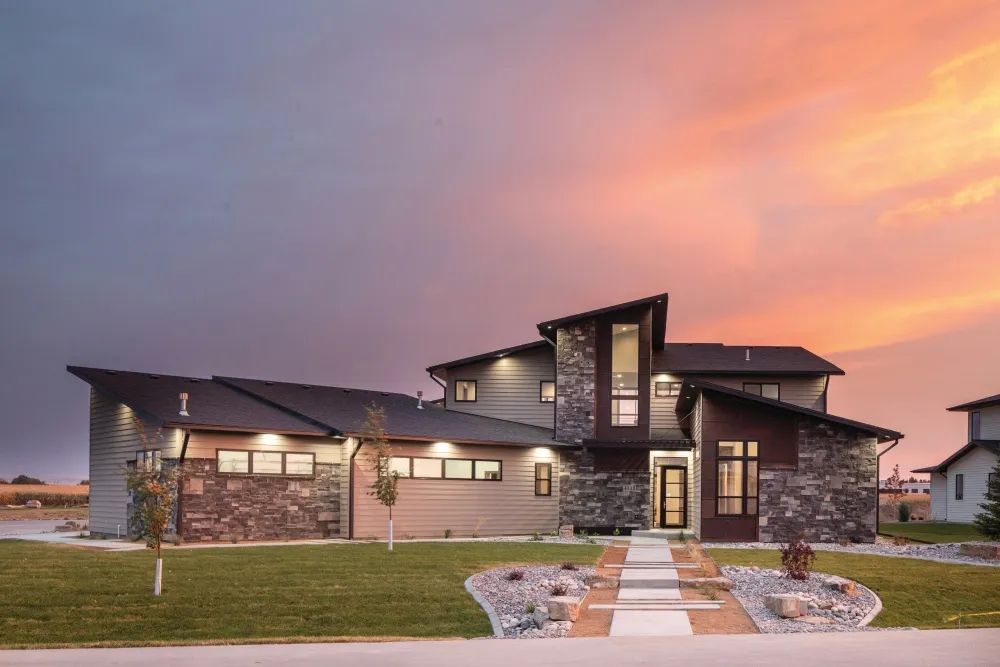 This striking Ban Construction home, located at 1337 Fisher Island Place in The Nines Subdivision, features an angular footprint and sloping roof lines adding a new twist to Prairie Modern. The unique slab pavers set in crushed granite draw you into the recessed front entry. There you are met with lovely black stone walls beneath a cedar inset that looks as if it is rusted metal. You begin to get a sense of what you are about to experience.