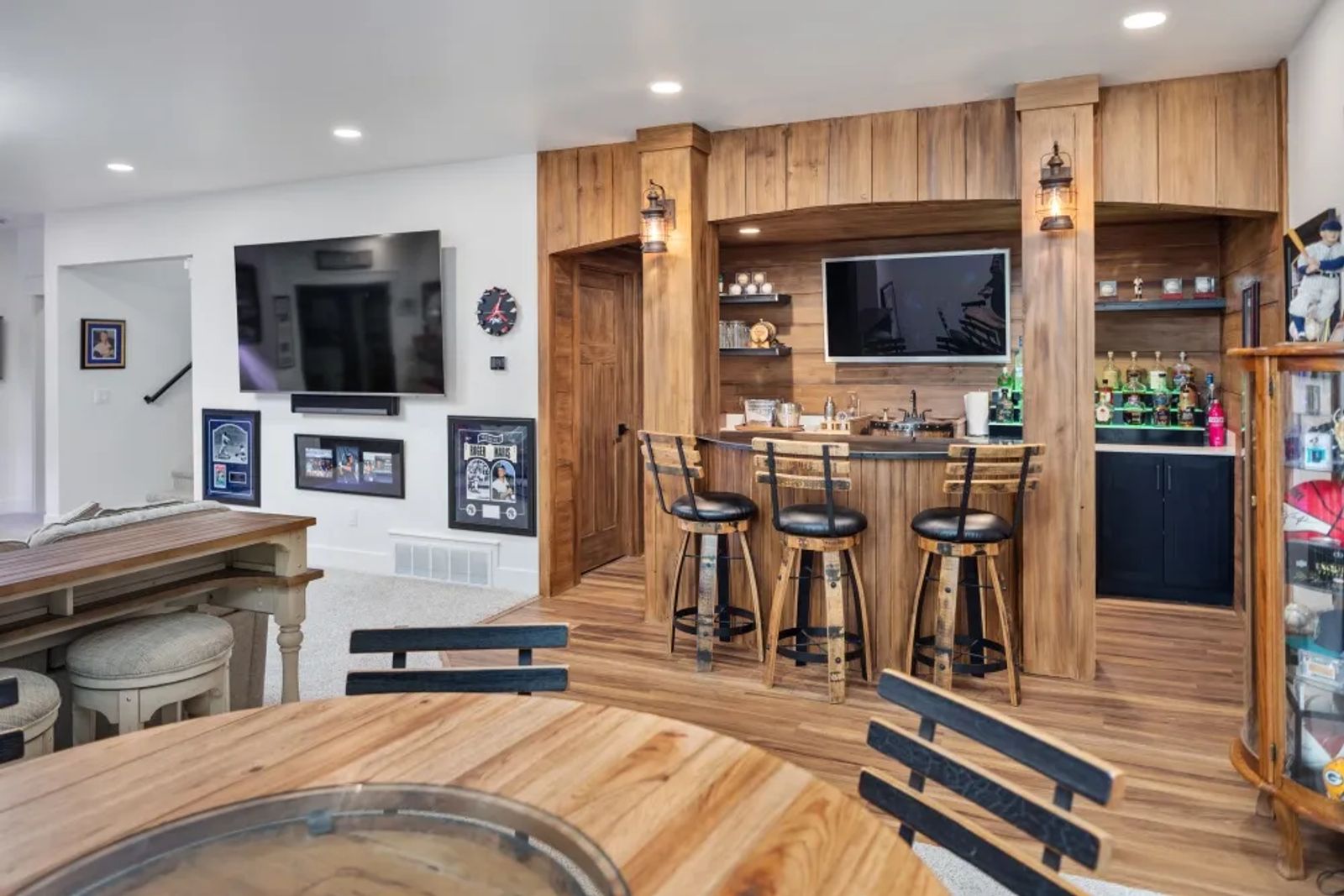 Mac’s work shines in the bar area where the couple wanted to incorporate an Irish Pub feel in honor of Quinn’s Irish roots. There’s a whiskey barrel sink, steel counter from a steelyard, and hand-painted wood.