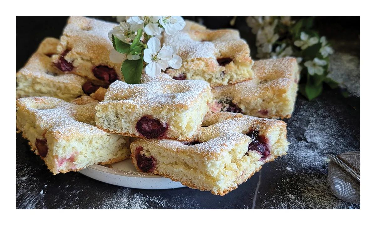 Light as a sigh, soft as a memory, this was the cake of my childhood summers, and it is now one of my most beloved family recipes. I can still picture my father whisking the yolks and sugar with a wooden spoon until pale and frothy, while my mother, always meticulous, beat the whites to soft peaks. And me? I was the cherry thief, sneaking the pitted fruit one by one, stained fingers and all. These days, baking this cake is a cherished summer ritual during cherry season. My kids and I make it with tart Montmorency cherries picked from our own tree, or with a bag of last year’s crop pulled from the freezer. Tart cherries are fairly uncommon in our area; feel free to substitute them with sweet and plump Flathead cherries or even with ripe Italian plums for an equally delightful result.
