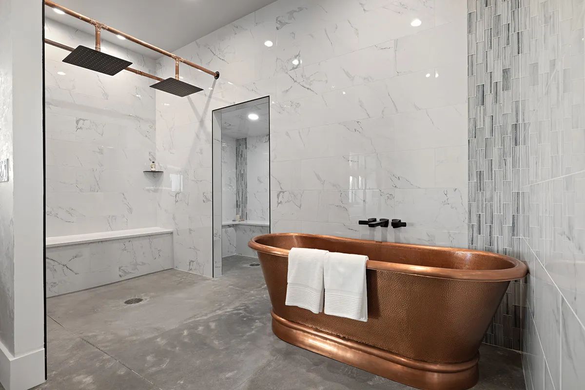 Double vanities are conveniently located on opposite walls while the wraparound design reveals a stunning, freestanding copper bathtub and adjacent walk-in shower. The exposed copper piping is striking and is another nod to the builder’s affection for industrial textures. A separate steam shower room creates a spa-like atmosphere. With maintenance-free concrete flooring throughout and zero thresholds in all showers, the bathroom is an easy escape.