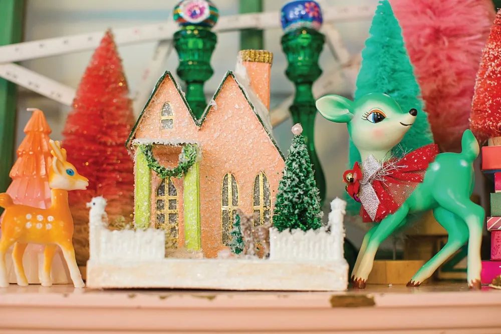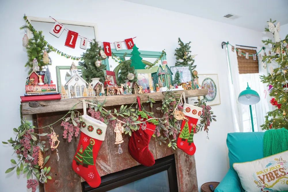 The electric fireplace framed in reclaimed barn wood adorned with classic green and red proves that it can exist side-by-side with a happy, bright medium. Upon the mantle, you will find a couple of Putz houses; another classic weaved with bright green and, if you look closely, a garland of glass leaf beads strung seamlessly along a vintage Christmas banner.