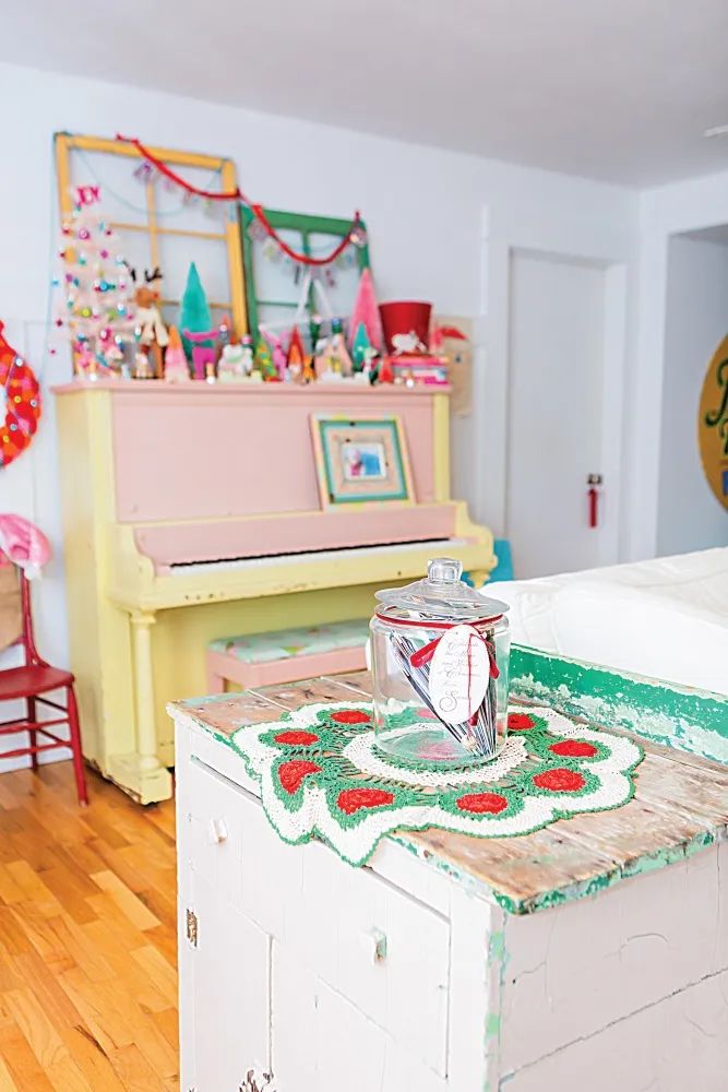 The stylish and fashionably distressed piano covered in Christmas accessories with a perfect color scheme is pure eye candy! On top of it all, you will find her latest craze, the sweet deer. An assortment of glass, fabric, velvet, and plastic. If you could play the piano, wouldn't you want to play those notes associated with classic Christmas carols?
