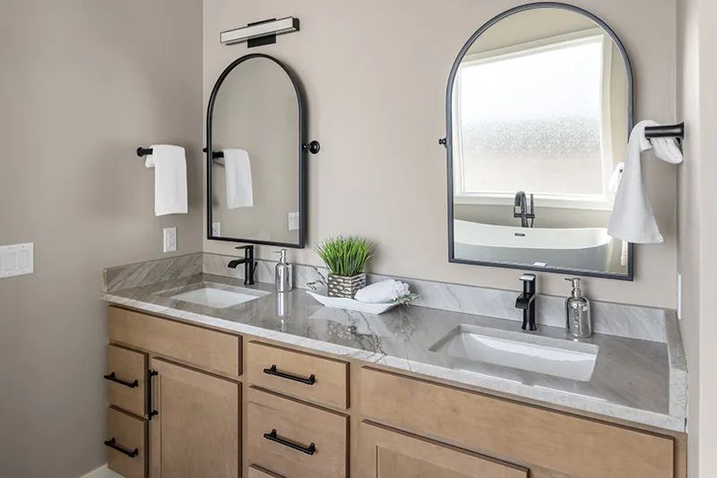 Classic Design Homes knows a kitchen isn’t just a place to cook. With its oversized quartzite island and space-saving conveniences, the open kitchen beckons family and friends to gather. When it comes time for cooking, the sleek and functional wall oven and microwave combo save valuable space while adding a modern touch. The kitchen is wrapped in maple-colored cabinets, and the island stands out with its deep brown hue. The contrast is captivating and creates the illusion of more space.