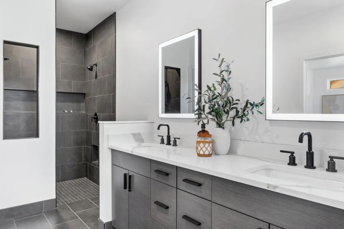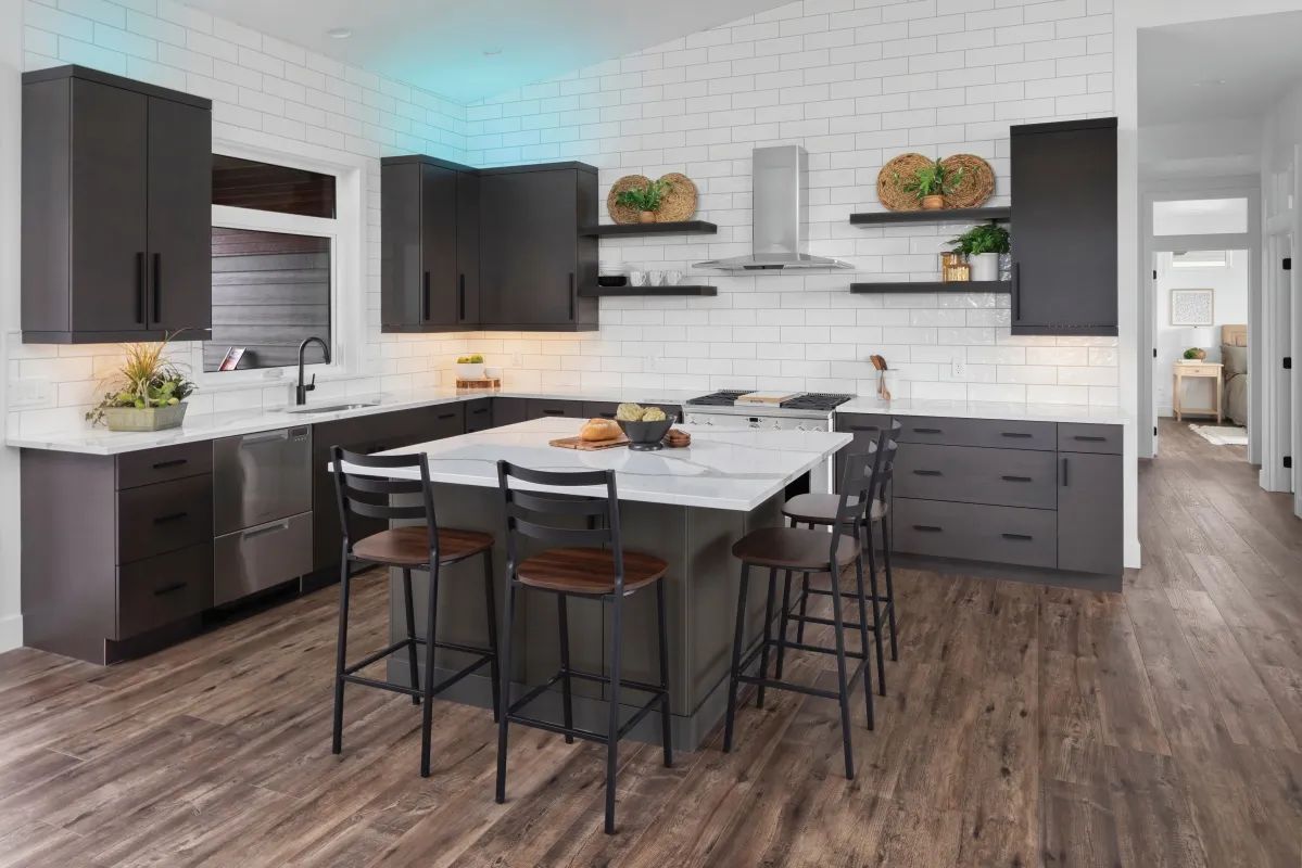 The open-concept kitchen flows from the great room and boasts oversized, textured, white subway tile, balanced by dark floating shelves flanking the range. The dining bar island is topped with Calacatta Quartz with gray veining to provide a striking contrast to the slate-colored cabinetry.