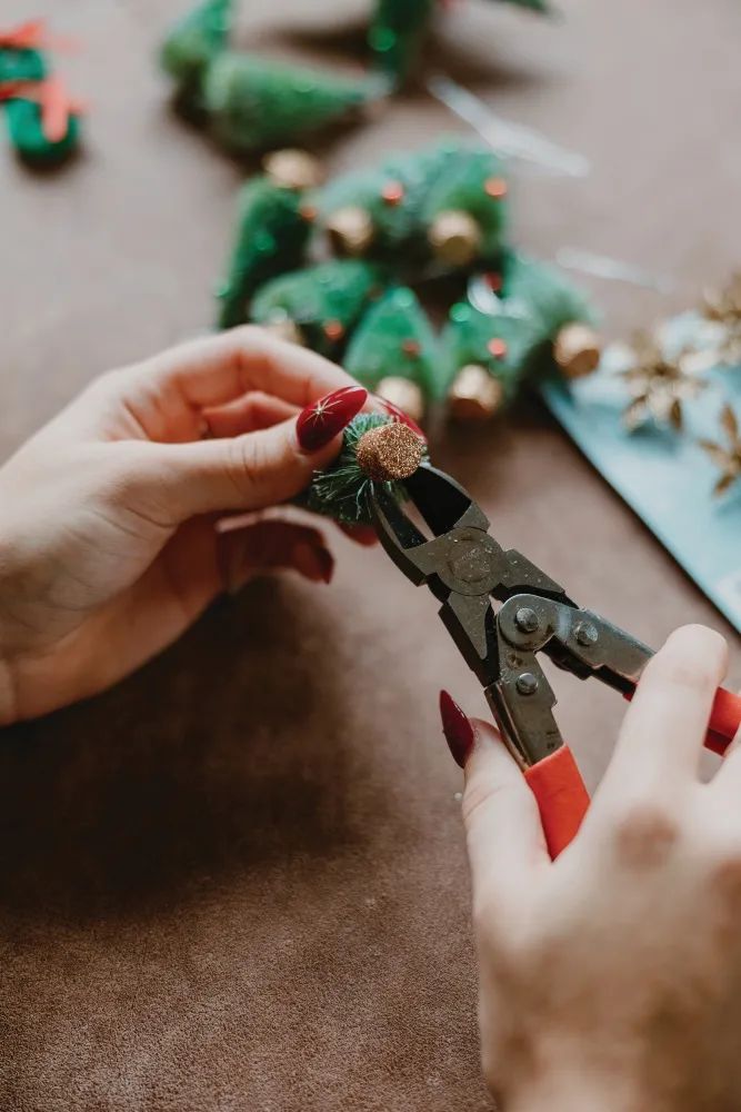 You will need seven small trees, hot glue and a glue gun, and decorations to make a miniature parol.