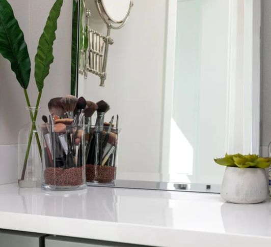 My other favorite clutter-hiding move is to make functional storage beautiful as well. It’s easy to leave makeup brushes in an old makeup bag that has ten years of blush build-up coating it. But it’s not exactly pretty. Besides, it’s a pain to find anything in it. Instead, put your brushes in a glass jar. The same goes for other oft-used products like cotton balls, q-tips, and soap. This way, they’re right on hand when you need them while at the same time, they’re creating texture in an area that can often feel too hard and smooth.