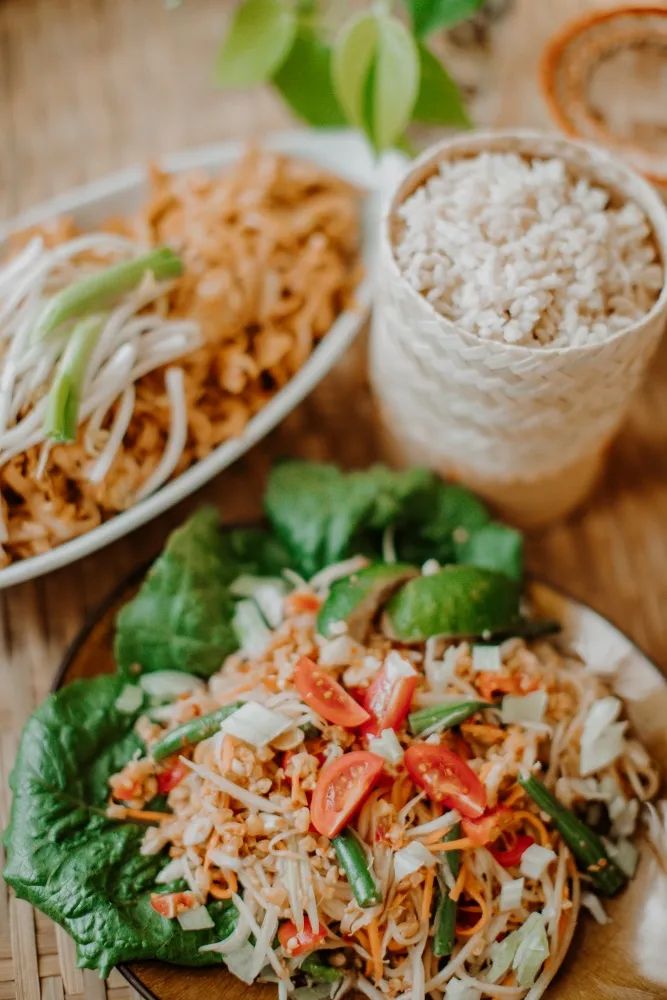 In a large bowl, whisk the papaya salad sauce, chili oil, lime juice, brown sugar, fish sauce, chopped peanuts, cilantro, and garlic cloves, and save this dressing for later. Bring a pan of salted water to a boil and then add the green beans, boiling for about 5 minutes, then rinse in cold water. Cut to desired length. Slice the papaya into a bowl using a peeler until you have about 5 or 6 cups of shavings. Add the remaining ingredients, and mix gently. Add the dressing and enjoy.