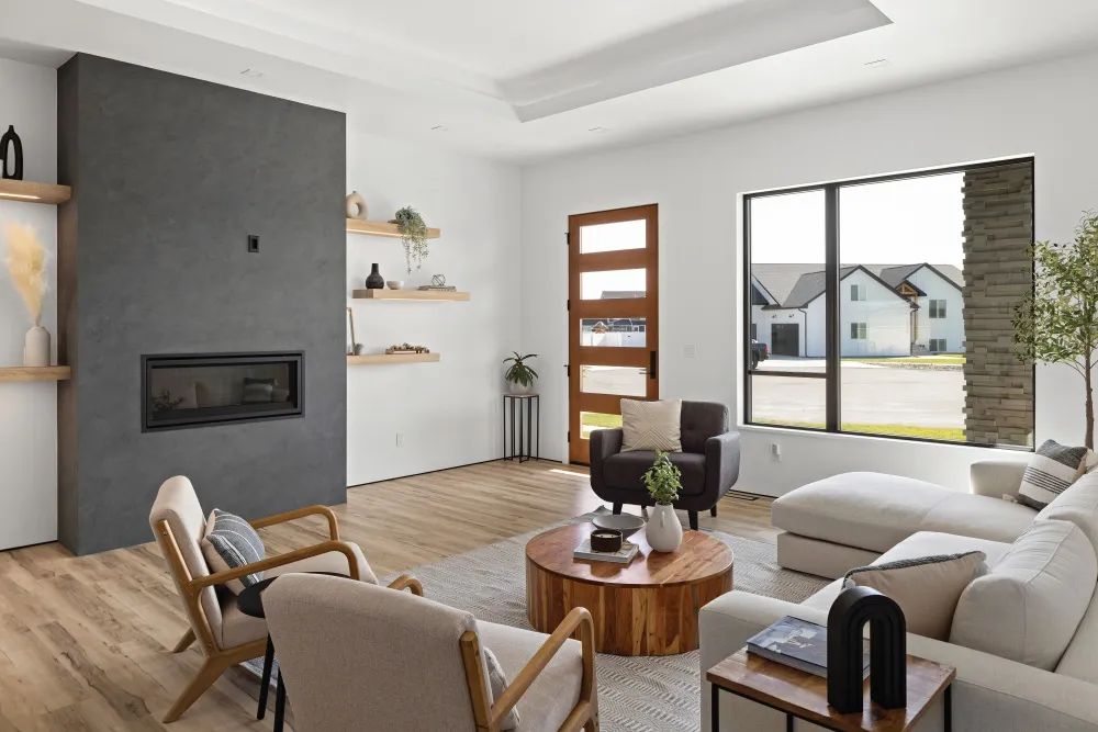 Lacking any window treatments, the large window in the Great Room allows natural light to flood the space throughout the day. The focal point, however, is the fireplace. The floor-to-ceiling fireplace surround is a statement piece finished using Roman Clay, a colored plaster providing a marble-like effect with a warm, earthy texture. Garnishing each end of the fireplace are floating shelves with recessed lighting, creating a sense of sophistication and comfort.