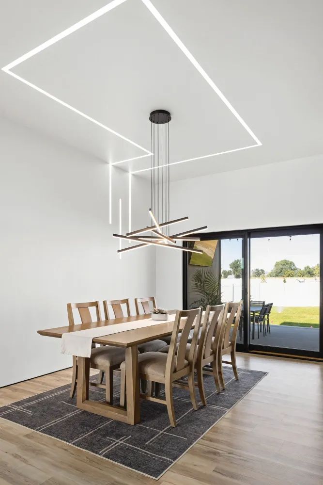 The kitchen reveals even more contemporary ways to illuminate the home with convenient toe-kick lighting, under-cabinet lighting, and even a motion-detected light in the pantry. The strip lighting featured on the dining room ceiling and down the wall is striking, and the state-of-the-art technology will deliver wow and wonder to homeowners and guests alike.