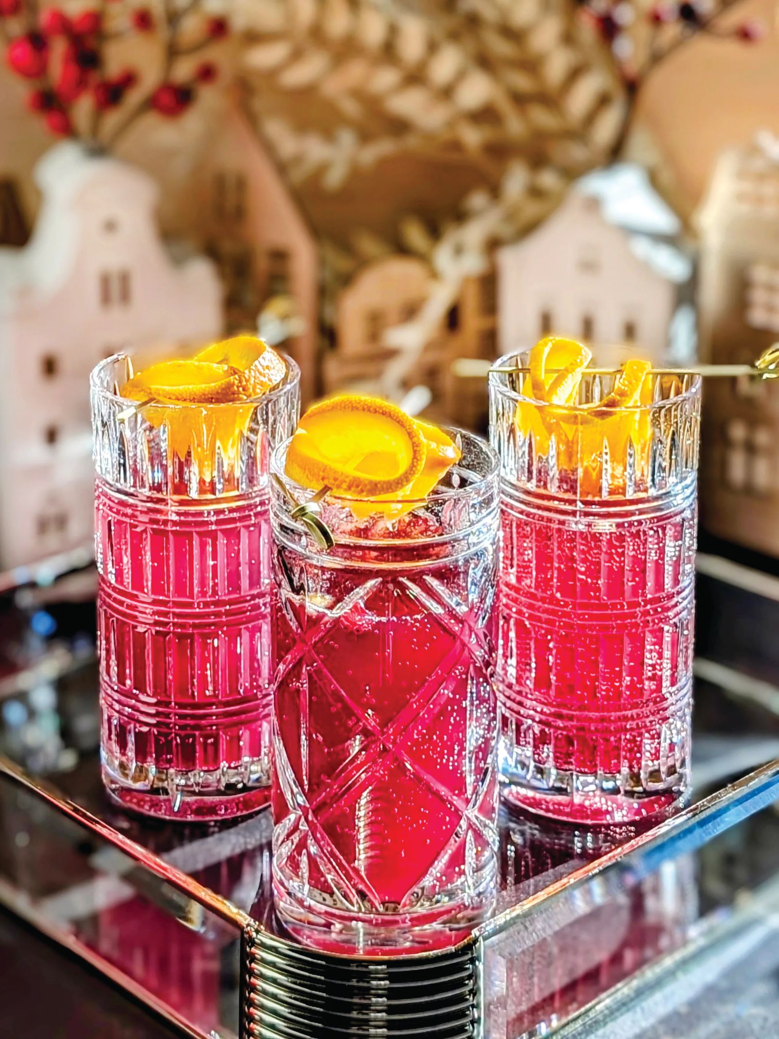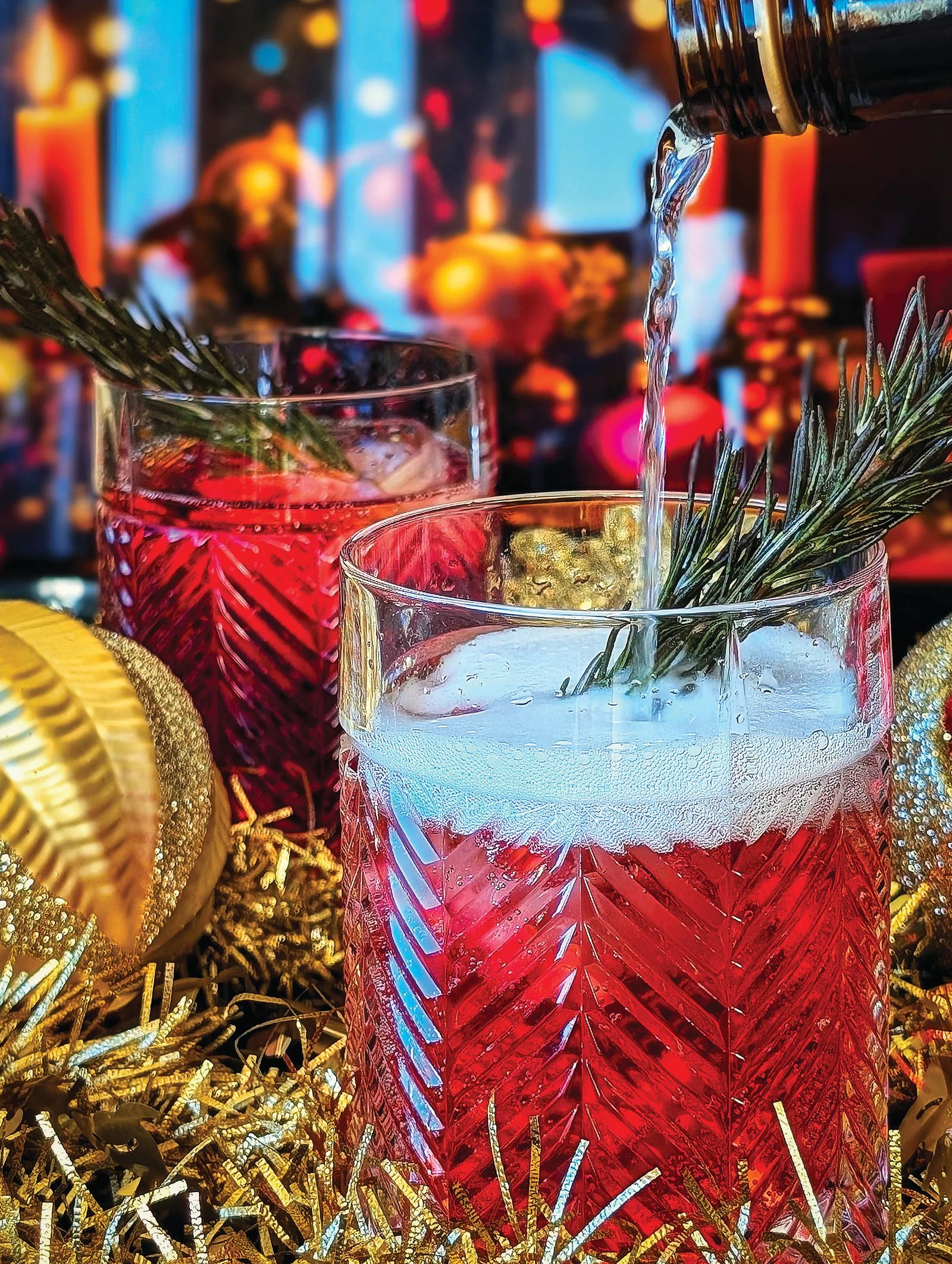 The classic mimosa, a brunch staple, gets a festive makeover appropriate for the winter holidays. Dressed in vibrant, Christmas-inspired hues, this sparkling blend of cranberry juice, orange liqueur, and champagne is a must-try this season. A crystal-clear ice puck filled with cranberries and decorated with rosemary elevates the presentation and it is surprisingly simple to make.