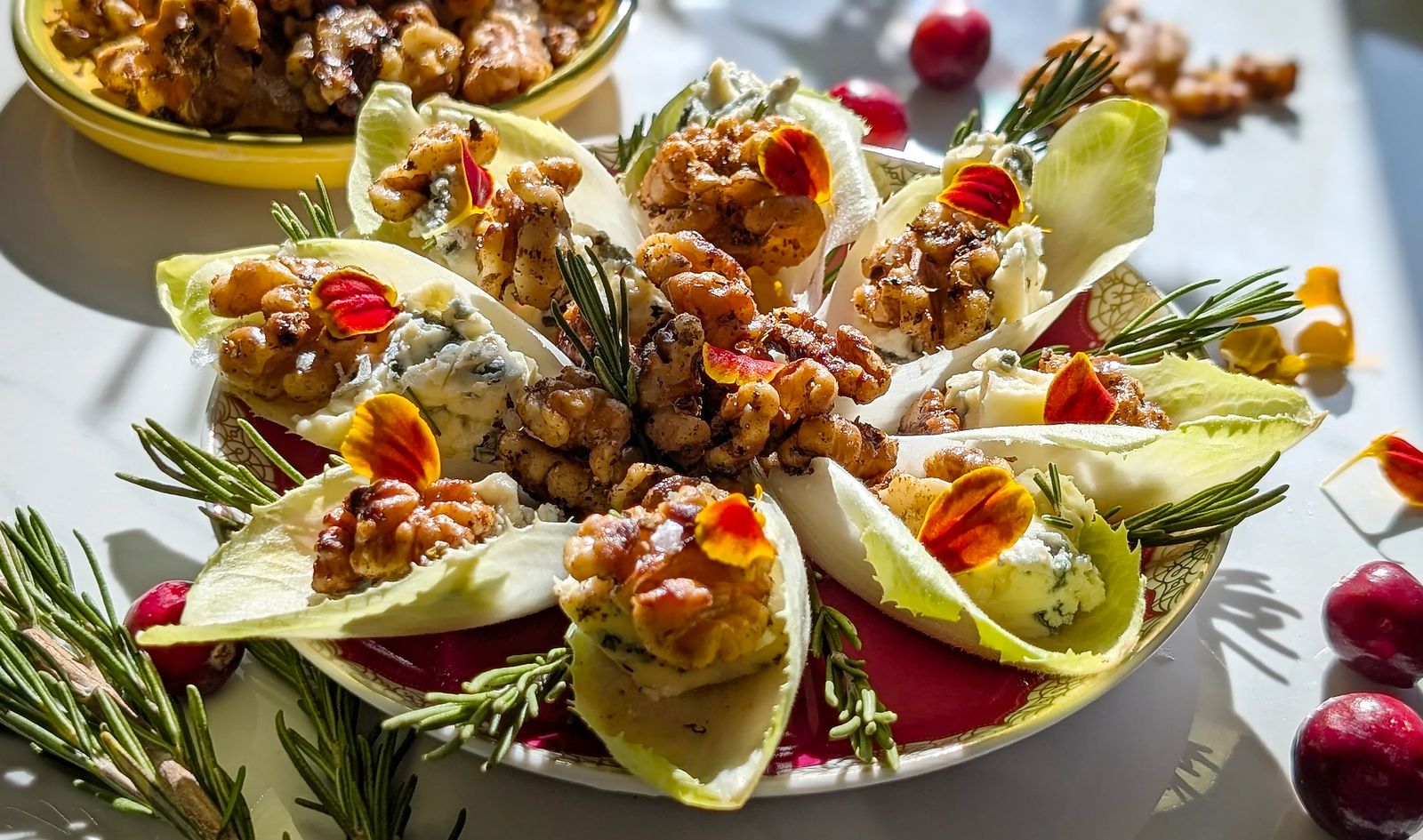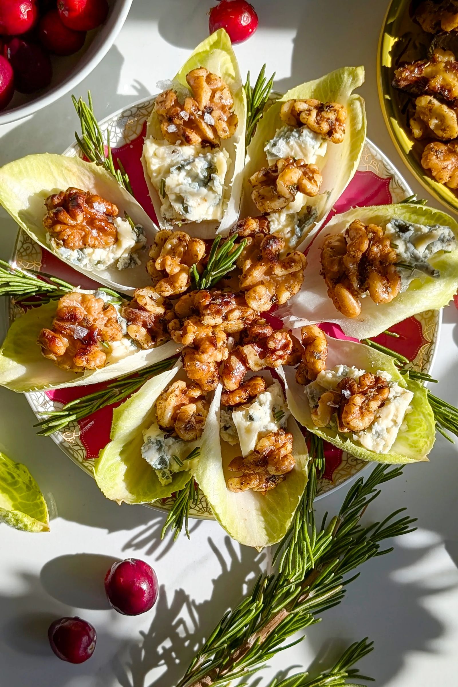 - Arrange the larger endive leaves on a serving platter. Aim to have uniform-size leaves if possible. Fill each leaf with a teaspoonful of crumbled Stilton cheese. Top with toasted spiced walnuts and garnish with fresh rosemary and pomegranate arils.