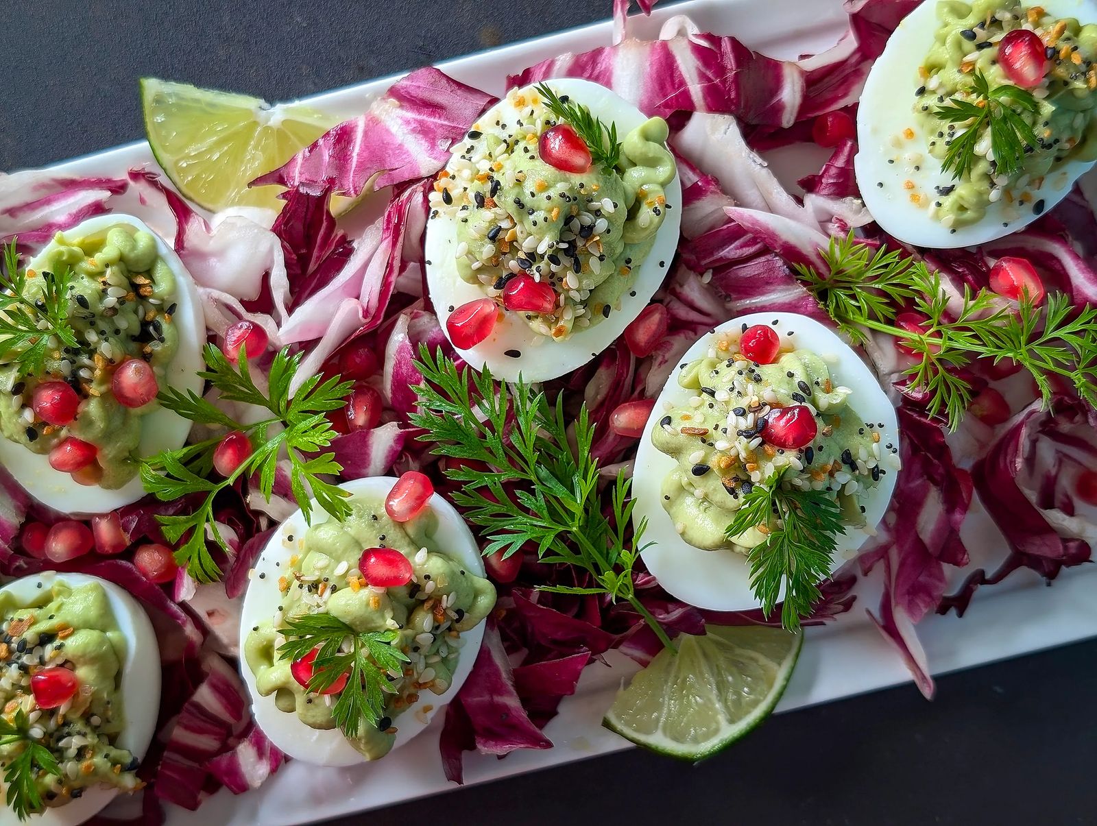 - Fill the egg whites with the avocado mousse and decorate each with a slice of jalapeño, one or two cilantro leaves, a few pomegranate arils, and a sprinkle of Everything Bagel seasoning.
