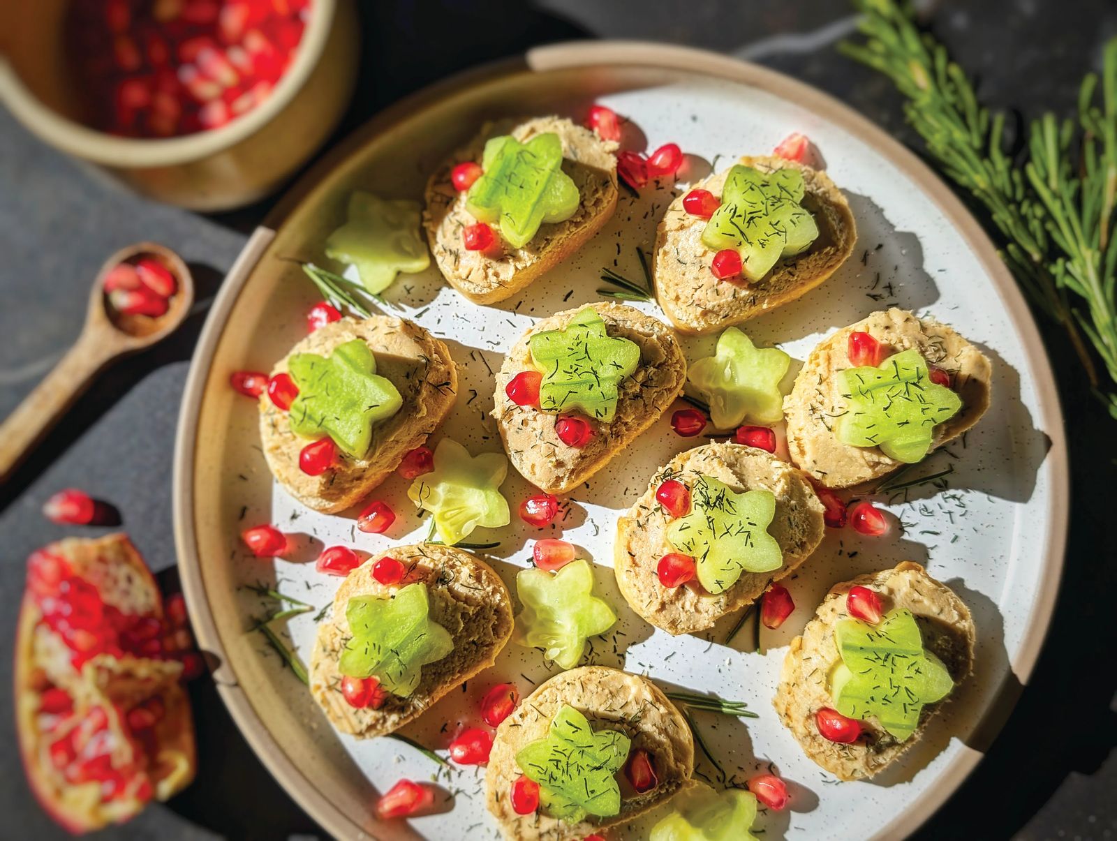 - Assemble the appetizer. Toast the baguette slices, if desired. Spread a tablespoon of salmon mousse onto each slice. Top with a cucumber disk. Decorate with pomegranate arils, fresh dill sprigs, and edible flower petals. For a lighter (and also gluten-free) version, replace the baguette slices with cucumber disks.