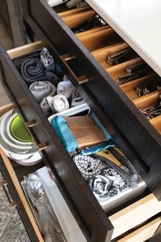 Whenever possible, I prefer to use drawers over cabinets for complete visibility and accessibility of the items stored inside—no more forgetting about things shoved to the back of the cabinet.