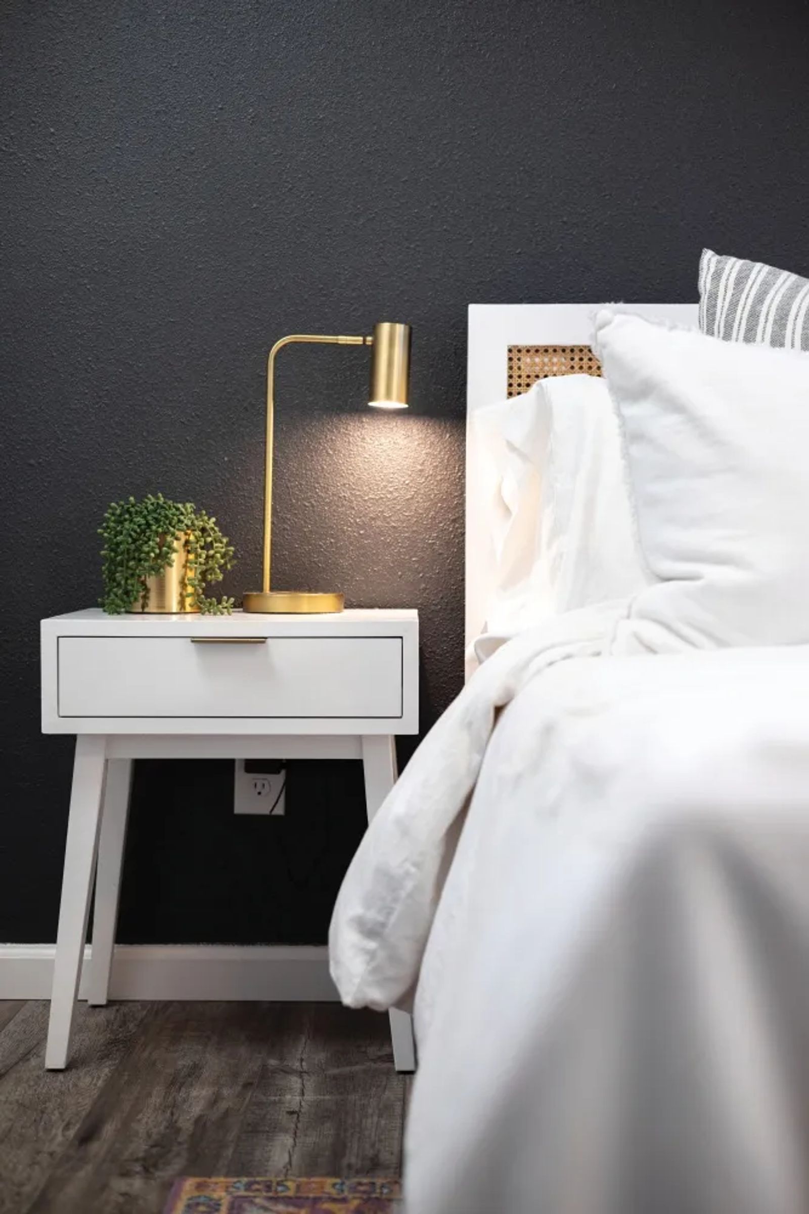 The master suite features a bit of drama with a dark focal wall and a beautiful complementary area rug. This practical and beautiful multi-purpose space serves as a spot for their young daughters to curl up and nap, a place to get some work done, and a relaxing retreat to rest at the end of a busy day.