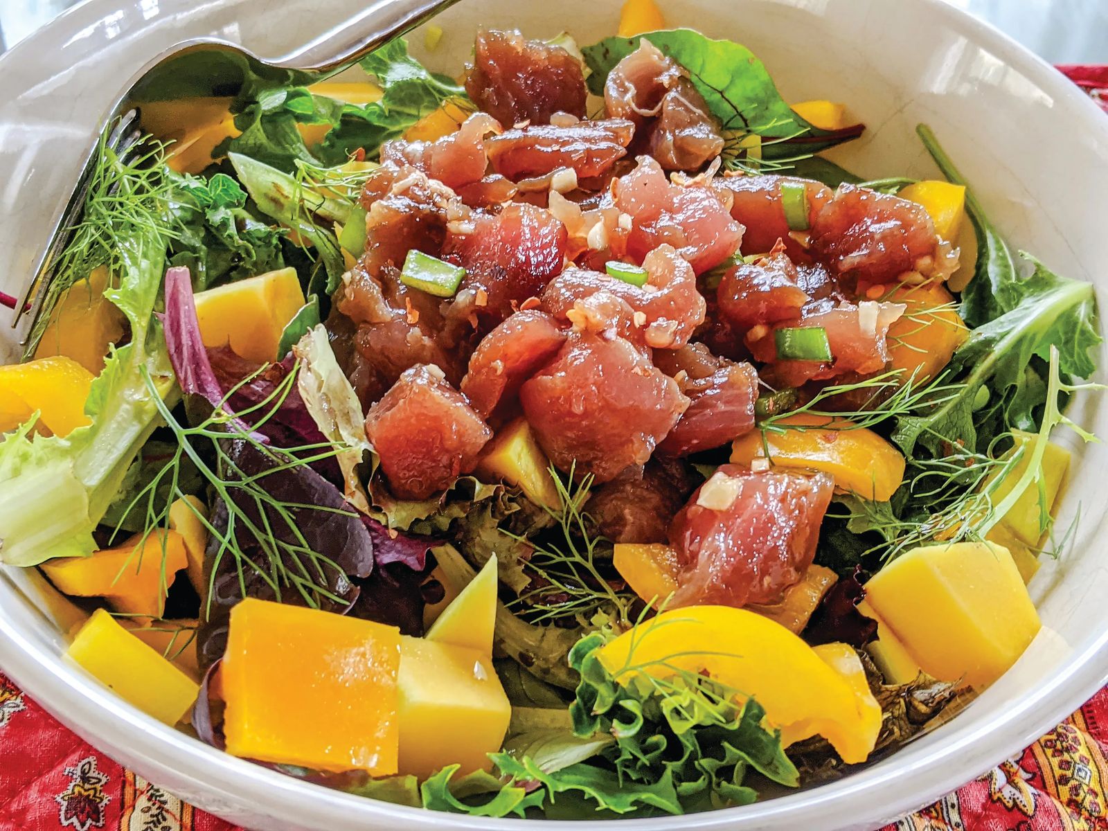 To make the ahi tuna poke: cut the ahi tuna (sushi-grade) into half inch cubes. Toss with the sesame oil, soy sauce, red pepper flakes, and onion until thoroughly coated. Refrigerate for 30 minutes before serving.