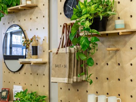 Wood textures create a warm and inviting feeling, but it’s helpful to soften them with some greenery. These cascading plants combine with the texture of the wooden pegboard wall to create a lively, unique focal point. (Special thanks to Jenna Jones at Salt + Sage Web Design for letting us get pictures of her great design.)
