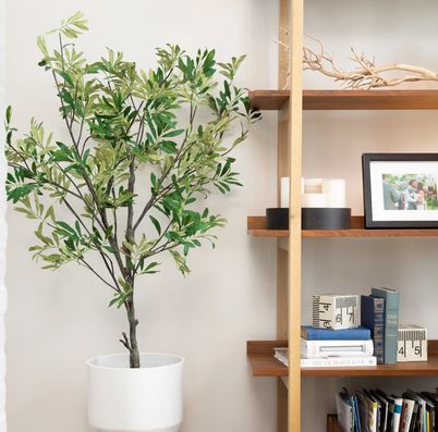 Are you tired of fiddle leaf fig trees? Try something unexpected like an olive tree. Its sage-like color pairs well with pops of jewel-tone colors.