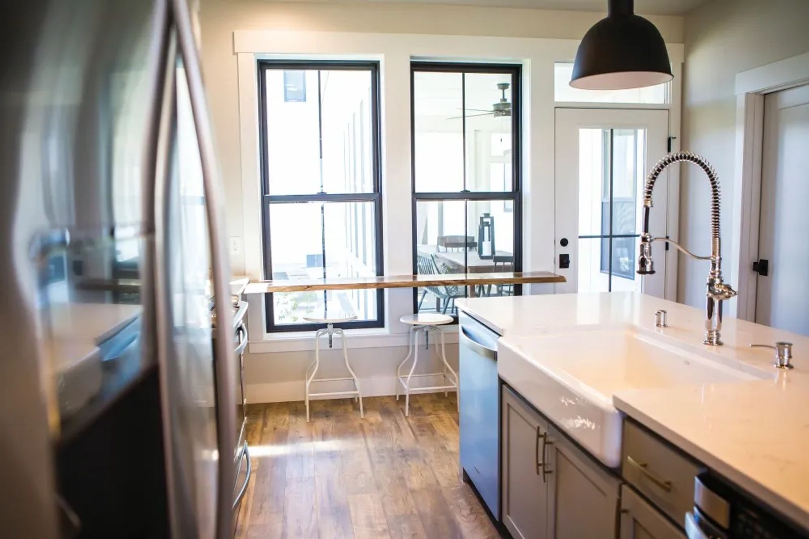 There’s nothing ordinary about this custom kitchen. From the white-painted brick façade backsplash (matching the living room fireplace) to a raw edge wood breakfast bar, the heart of this home is flooded with character and light.