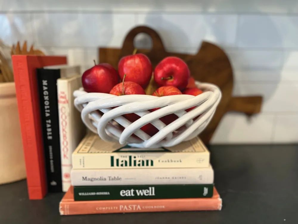 I was drawn to the shape of this porcelain woven bowl because of its visual interest and large size. I loved how the gaps in the weave would showcase the items nestled inside, making it a great bowl to display natural elements. It was in excellent condition, so it just needed a quick scrub. Displayed with these beautiful apples piled high and full in the bowl to show off their color and create an easy grab-and-go snack for my family. I love decorating with seasonal items that are beautiful as well as edible. At just $7.99, this was a bargain given its unique character, large size, and perfect condition! Similar-sized generic bowels at Target would sell for at least 2-3x this price.