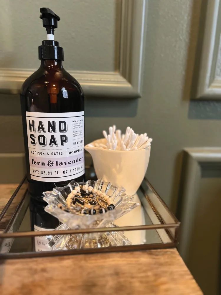 This mirrored tray seems like something that could easily go unnoticed. On its own, it isn’t anything remarkable. This item caused me to stop and think about using it in different ways throughout my home. I didn’t purchase it with an immediate plan, but because I knew its simplicity would make it versatile in multiple spaces. Plus, I didn't have much to lose for a glass item at just $2.99. I tinkered with the tray in several places throughout my home but decided I really liked it as a vessel containing items in my bathroom. The tray adds a sense of sophistication to this rustic bath as it reflects the glass jewelry dish.
