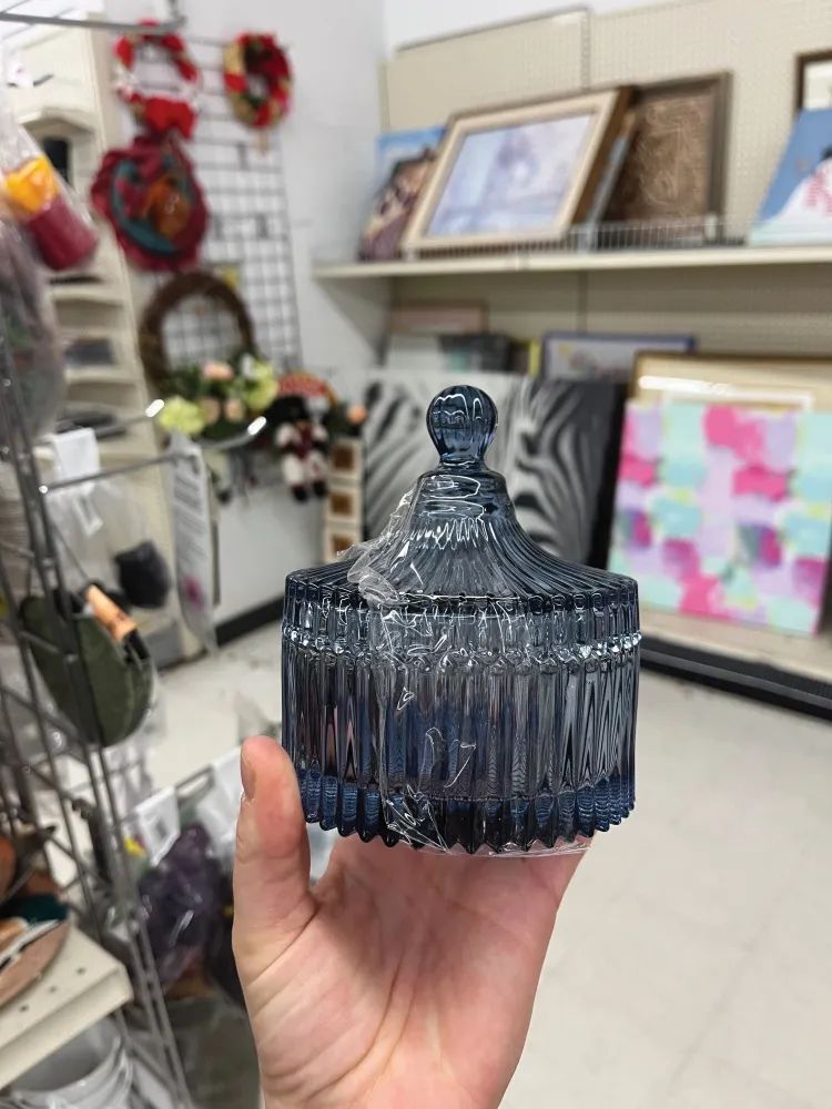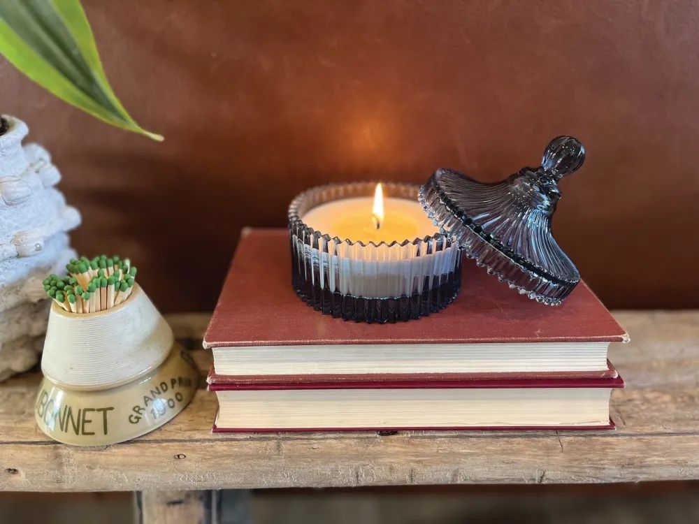 This jar was found on one of the few thrifting trips with a specific goal –vessels to transform into candles. When I saw this beautiful jar with the lid attached, I immediately knew it would be perfect. The color is gorgeous, the glass is thick, and the ribbing detail is likened to something from a high-end store like Anthropologie. This is one of those finds that keeps me returning to thrift repeatedly, unexpected and unique. After giving it new life as a candle, I styled it with some other vintage items. The jar was $3.99, a great deal for a unique vessel to upcycle as a candle.
