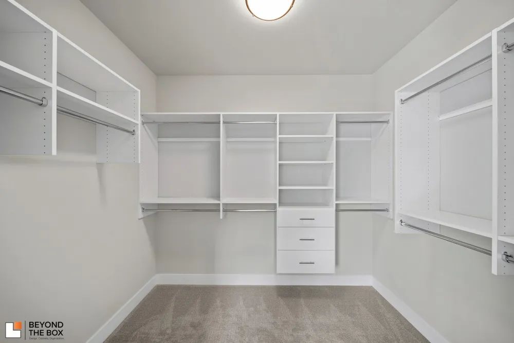 Anita Price, Closet Manager at Beyond the Box, says she loves working with clients to help them find storage solutions across a variety of budgets. “There are so many ways to elevate your closet. Some are as simple as shoe shelves, drawers, and a built-in hamper,” she said. “But for the closet enthusiasts that really want that elevated look, we have lots of options to choose from.” Such options include lighted clothing rods that come in different colors like black or gold, and can be wired to turn on when you enter the closet, lights behind cabinet glass doors, and leather drawers and shelves.