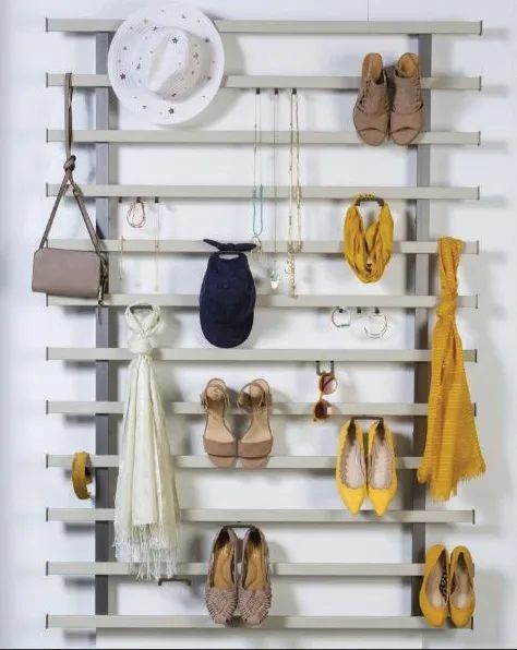 Price recommends wall hooks as an easy solution for stretches of flat walls where space is otherwise wasted. However, if you want to make an area both functional and beautiful, consider the Symphony system, which comes in different sizes and colored metals and leathers. It is a space-efficient way to store jewelry, belts, shoes, and hats. “It can even be used in an entryway as a stylish way to organize your belongings,” she said.